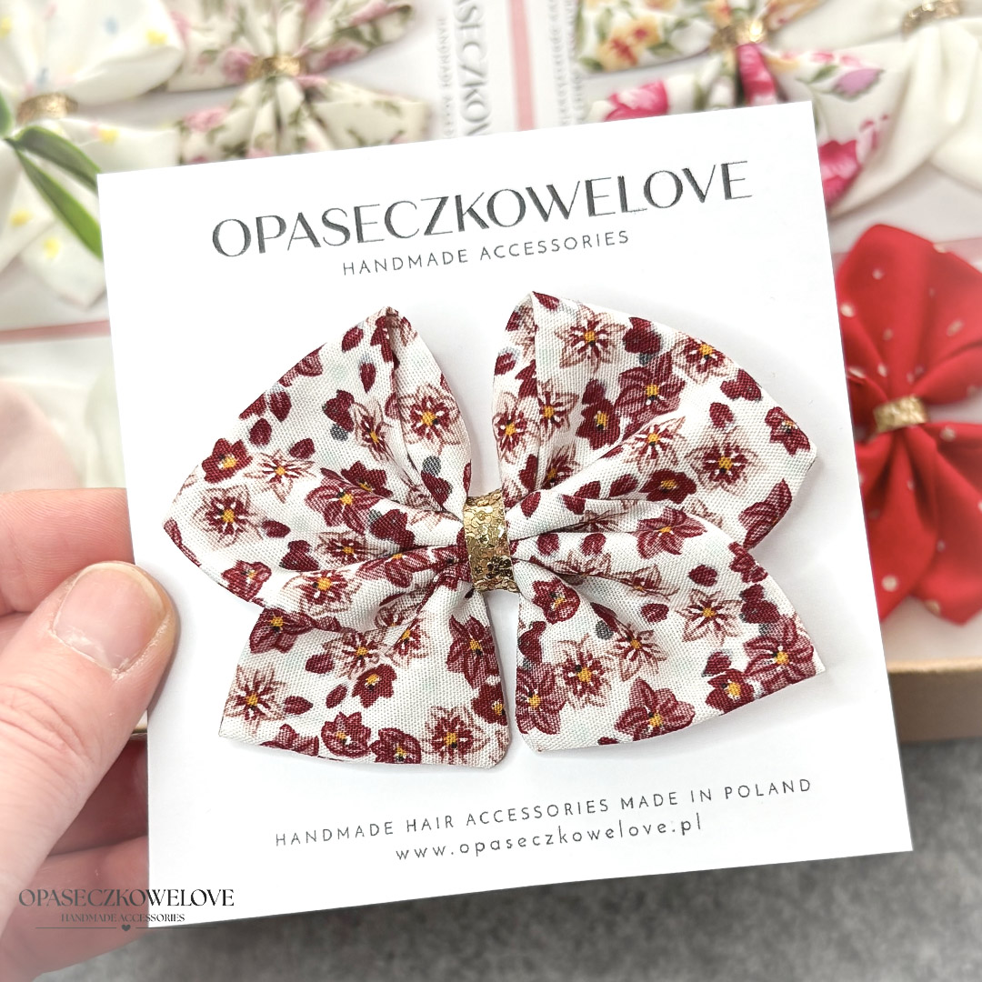 Kokardka Ali – biała w bordowe kwiatki – opaska / spinka