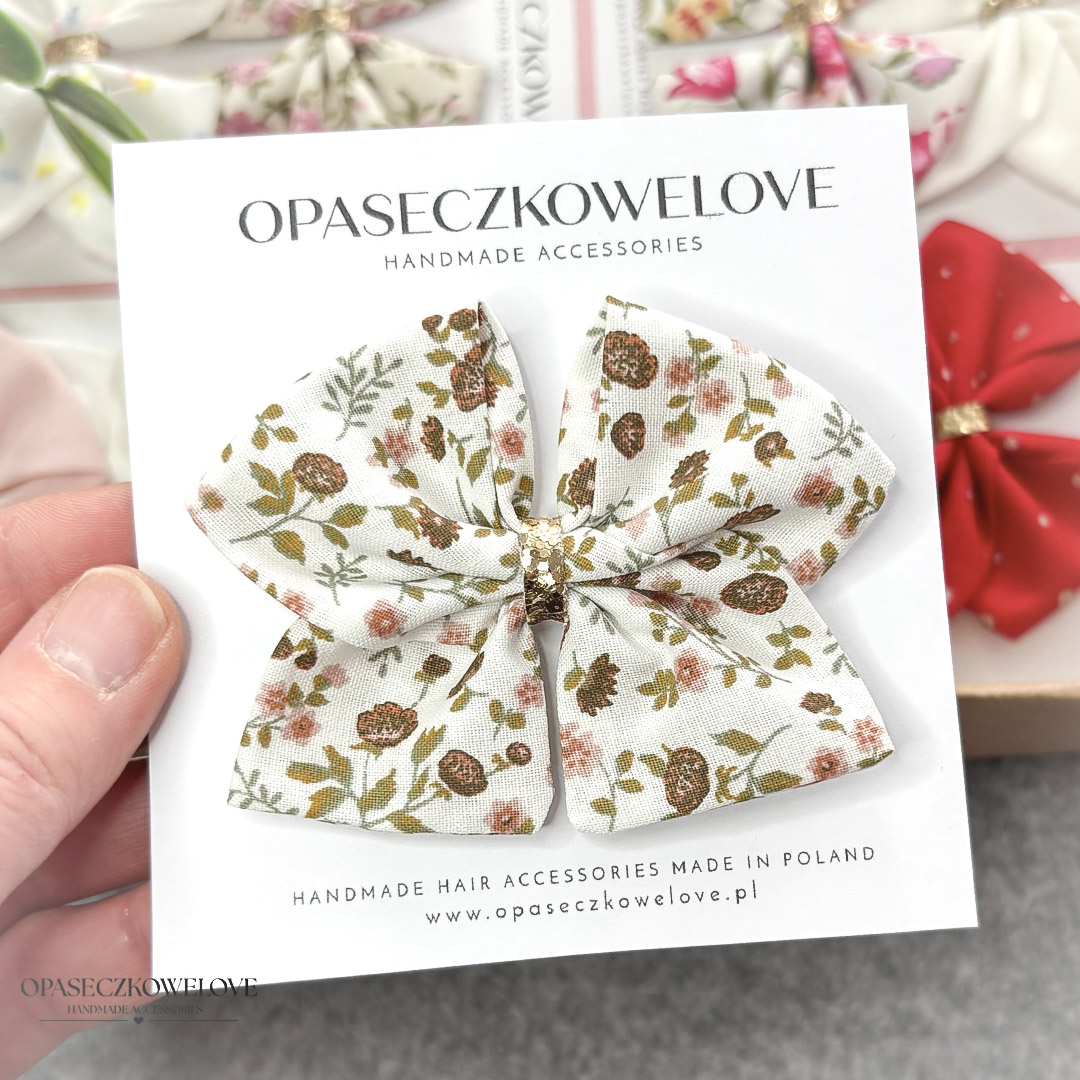 Kokardka Ali – biała w kwiatuszki brązowe – opaska / spinka
