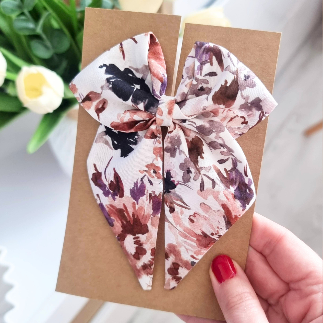 Kokardka Elen – spinka biała w brązowe kwiaty