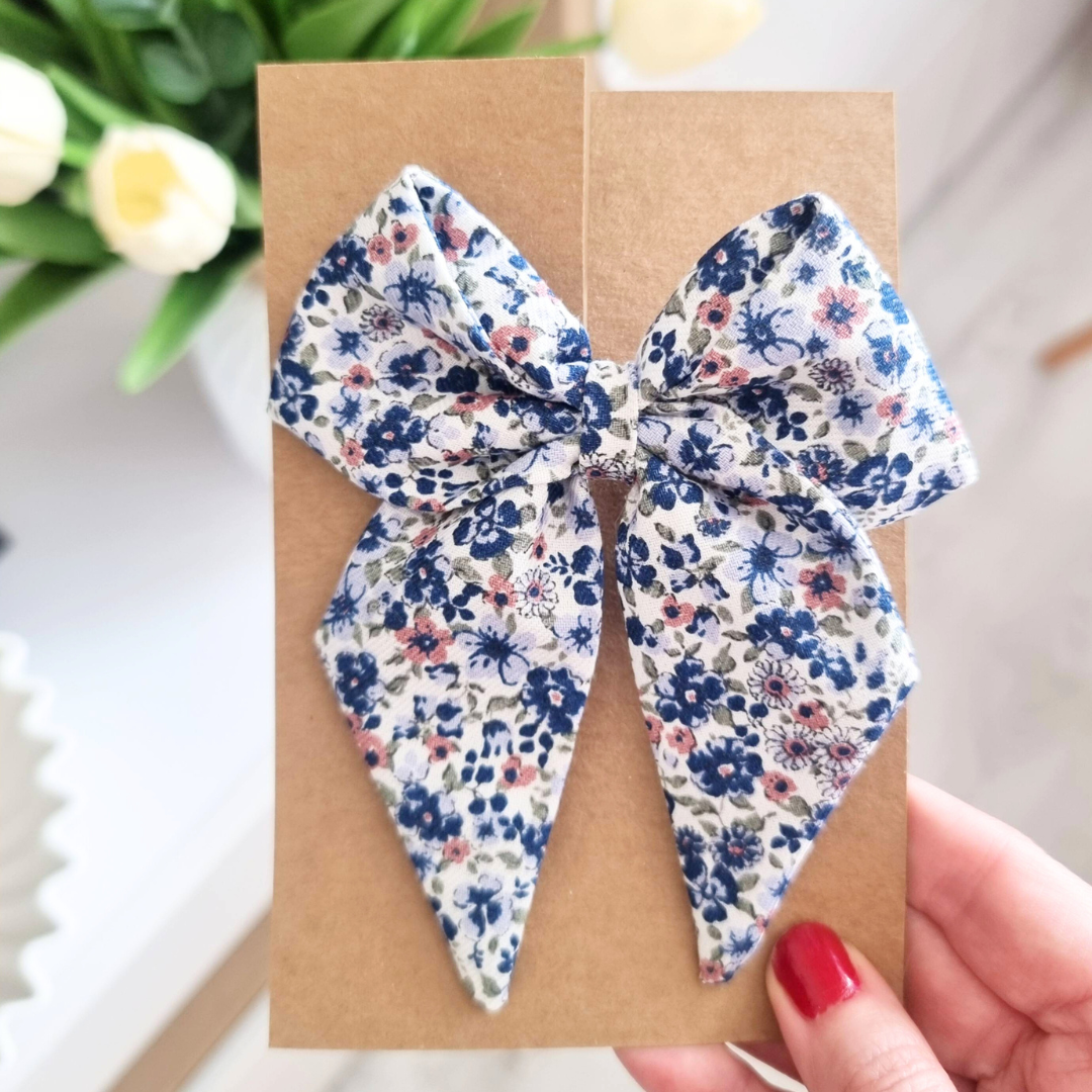 Kokardka Elen – spinka biała w niebieskie kwiatuszki