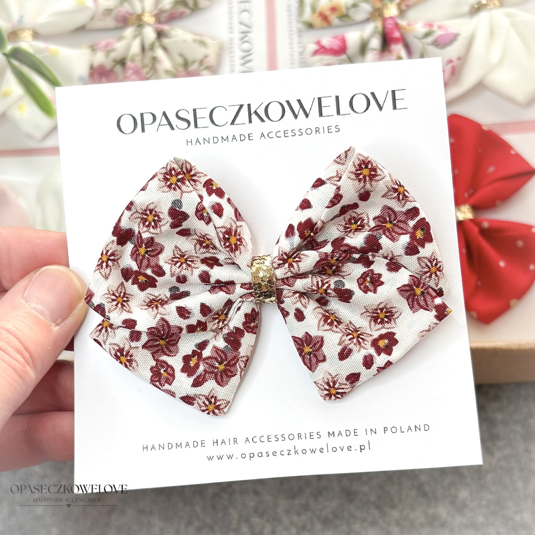 Kokardka Lili – biała w bordowe kwiatuszki – opaska / spinka