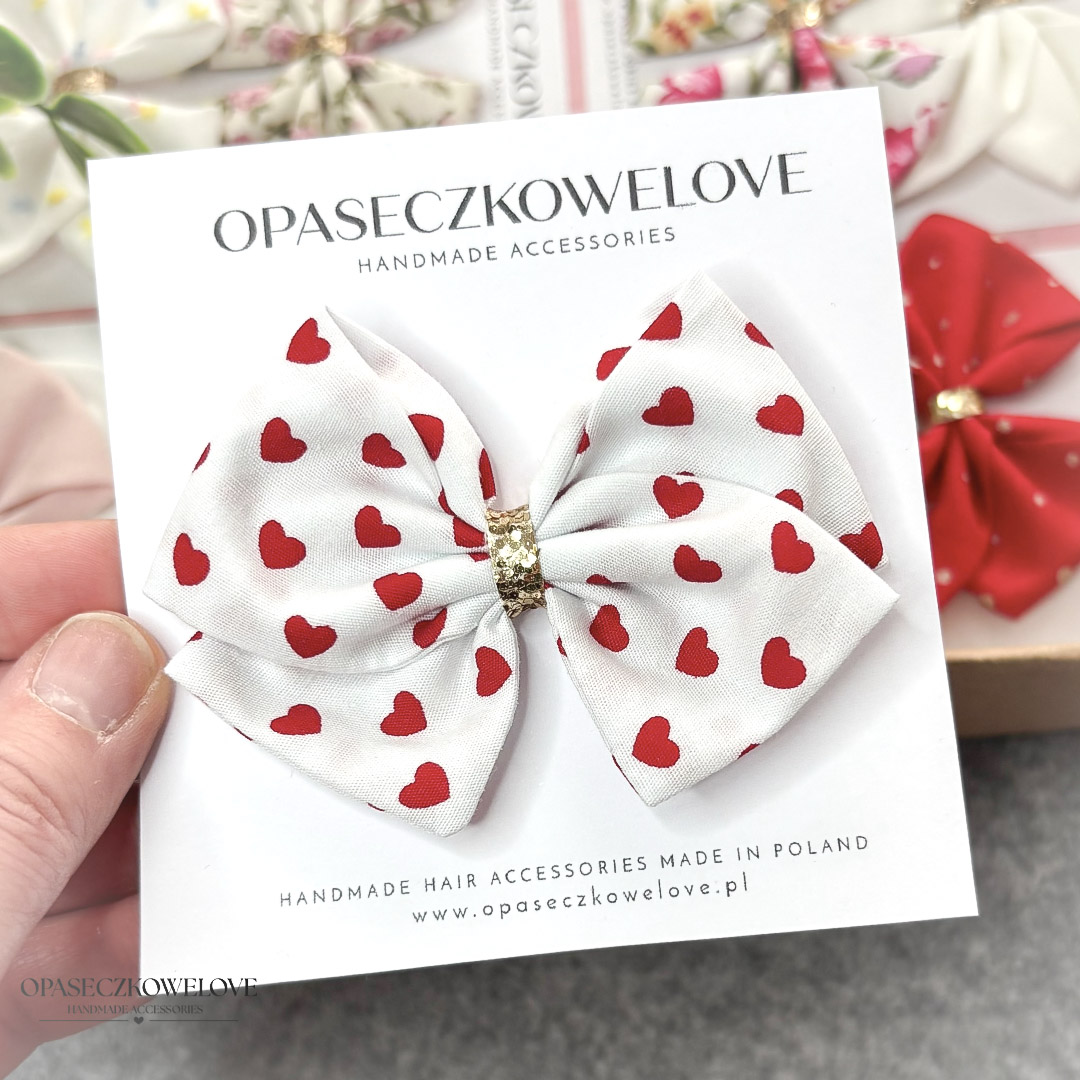 Kokardka Lili – biała w czerwone serduszka – opaska / spinka