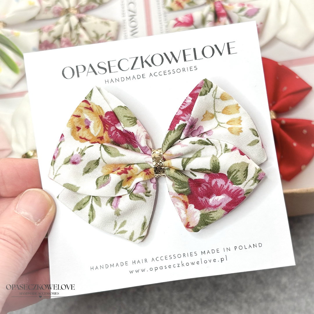Kokardka Lili – biała w kolorowe kwiaty – opaska / spinka