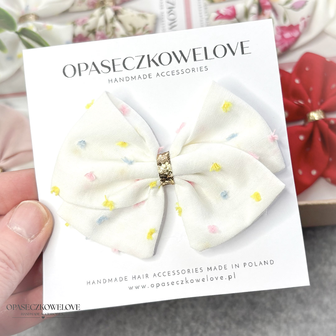 Kokardka Lili – biała w kolorowe plumetti – opaska / spinka