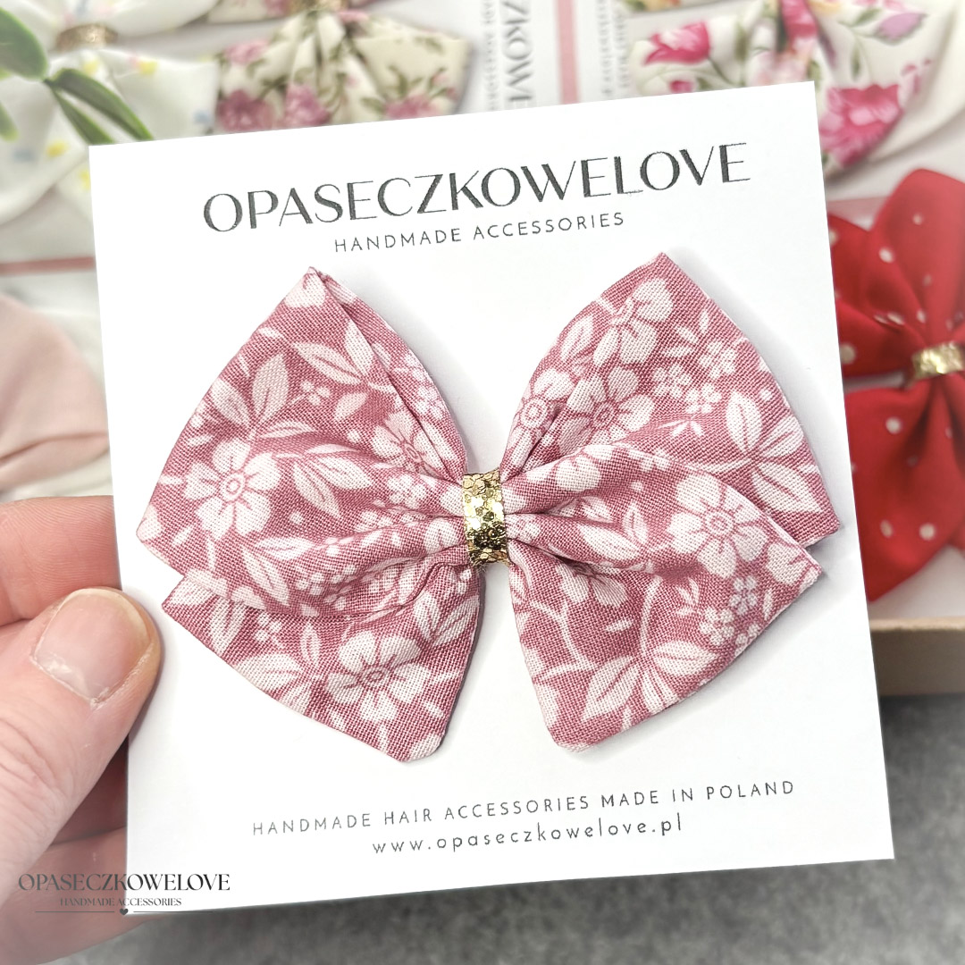Kokardka Lili – brudny róż w kwiatuszki – opaska / spinka
