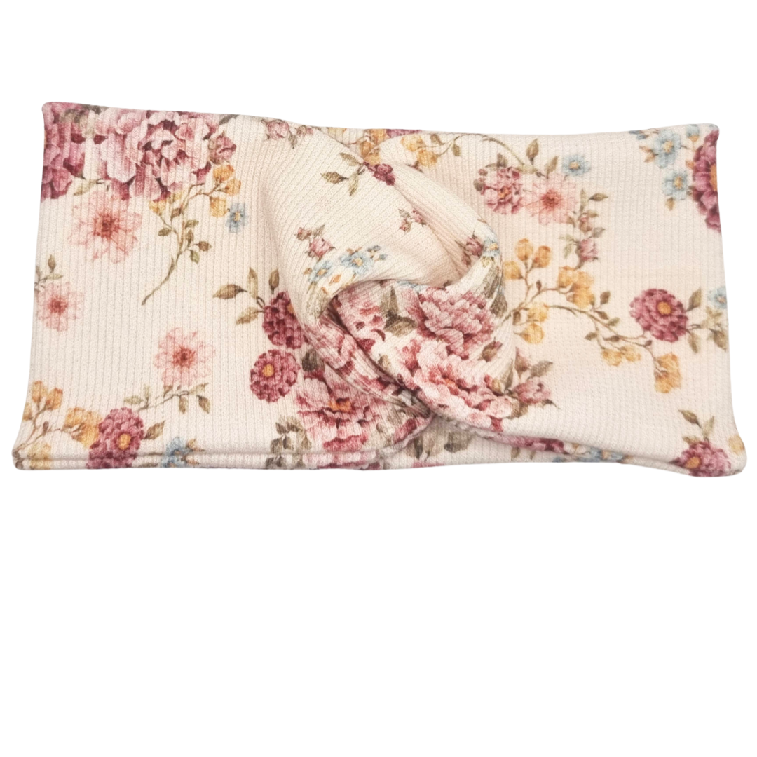 Opaska szeroka przeplatana na głowę beżowa w kolorowe kwiatuszki