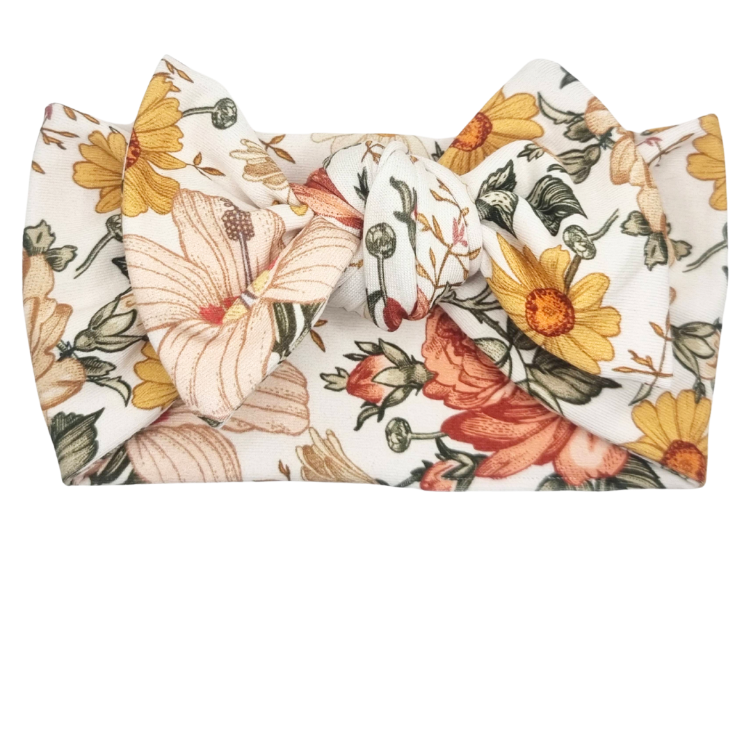 Opaska szeroka z kokardą biała w listki oraz kwiaty