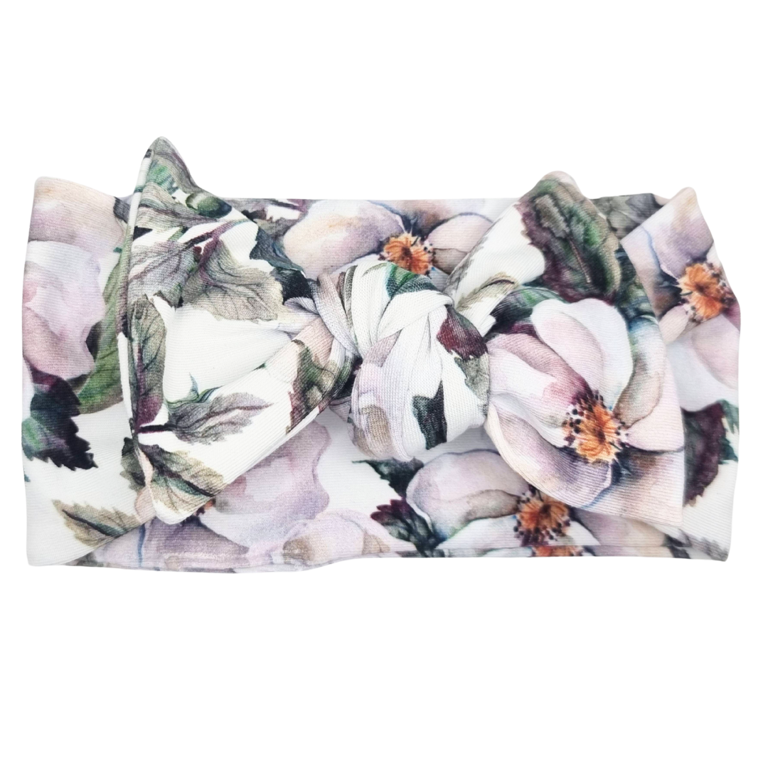Opaska szeroka z kokardą białe kwiaty i listki