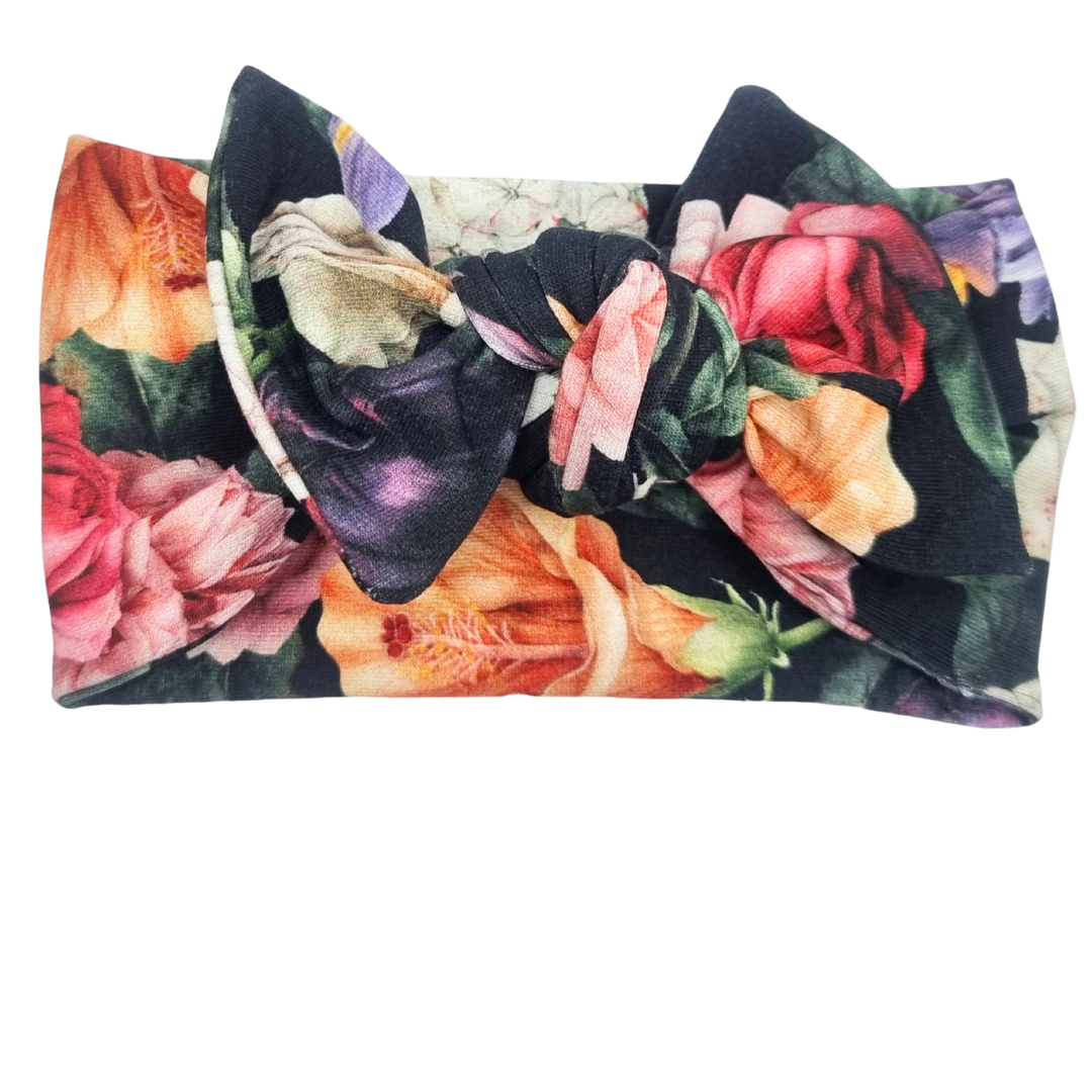 Opaska szeroka z kokardą czarna w duże kolorowe kwiaty