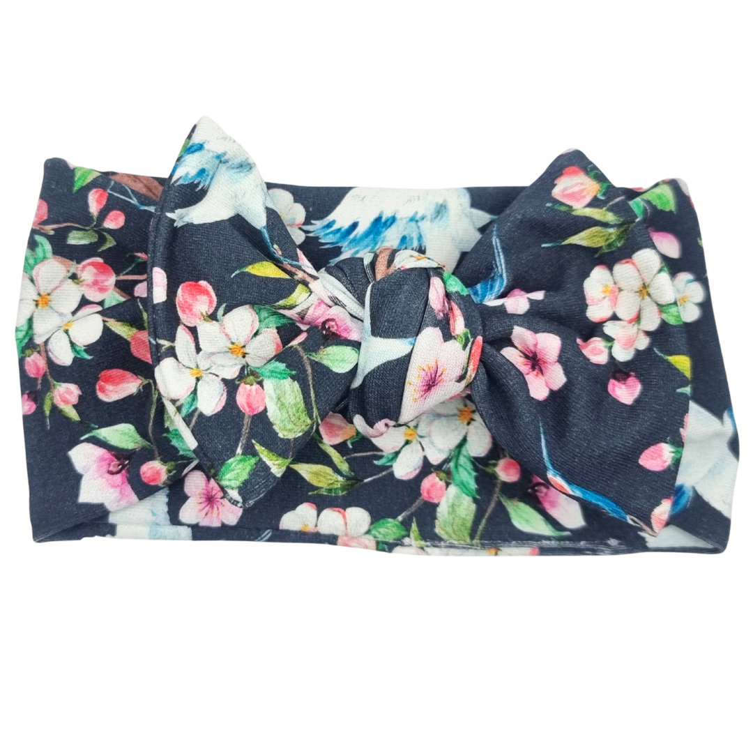 Opaska szeroka z kokardą granatowa w kwiaty wiśni