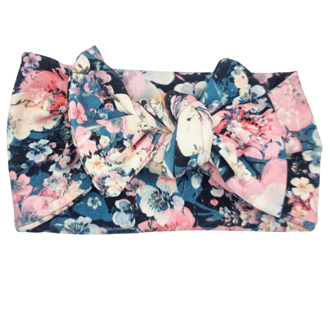 Opaska szeroka z kokardą kwiatki na granatowym tle