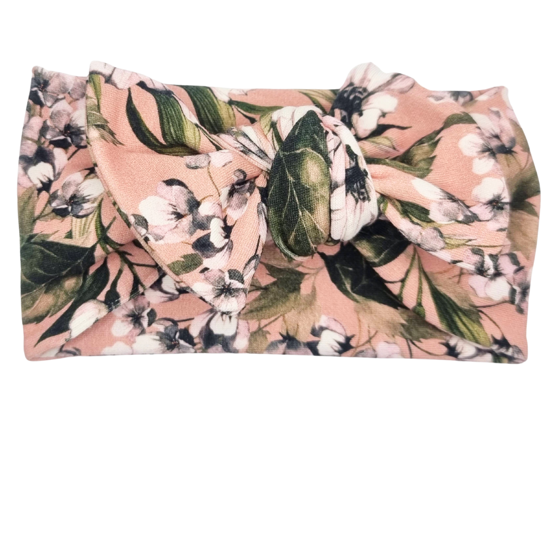 Opaska szeroka z kokardą listki i kwiaty na brudnym różu