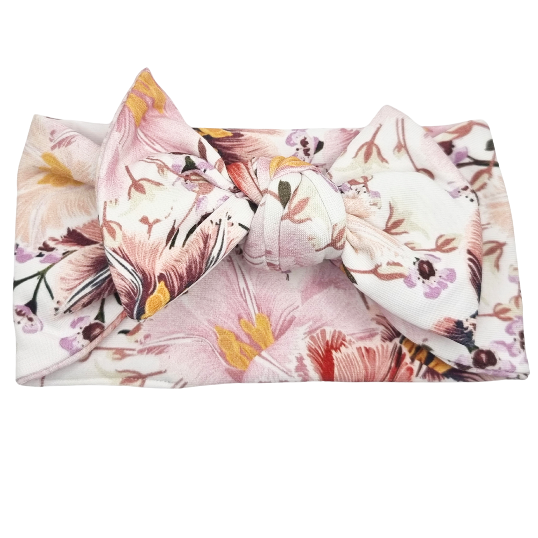 Opaska szeroka z kokardą pastelowe kwiaty i listki