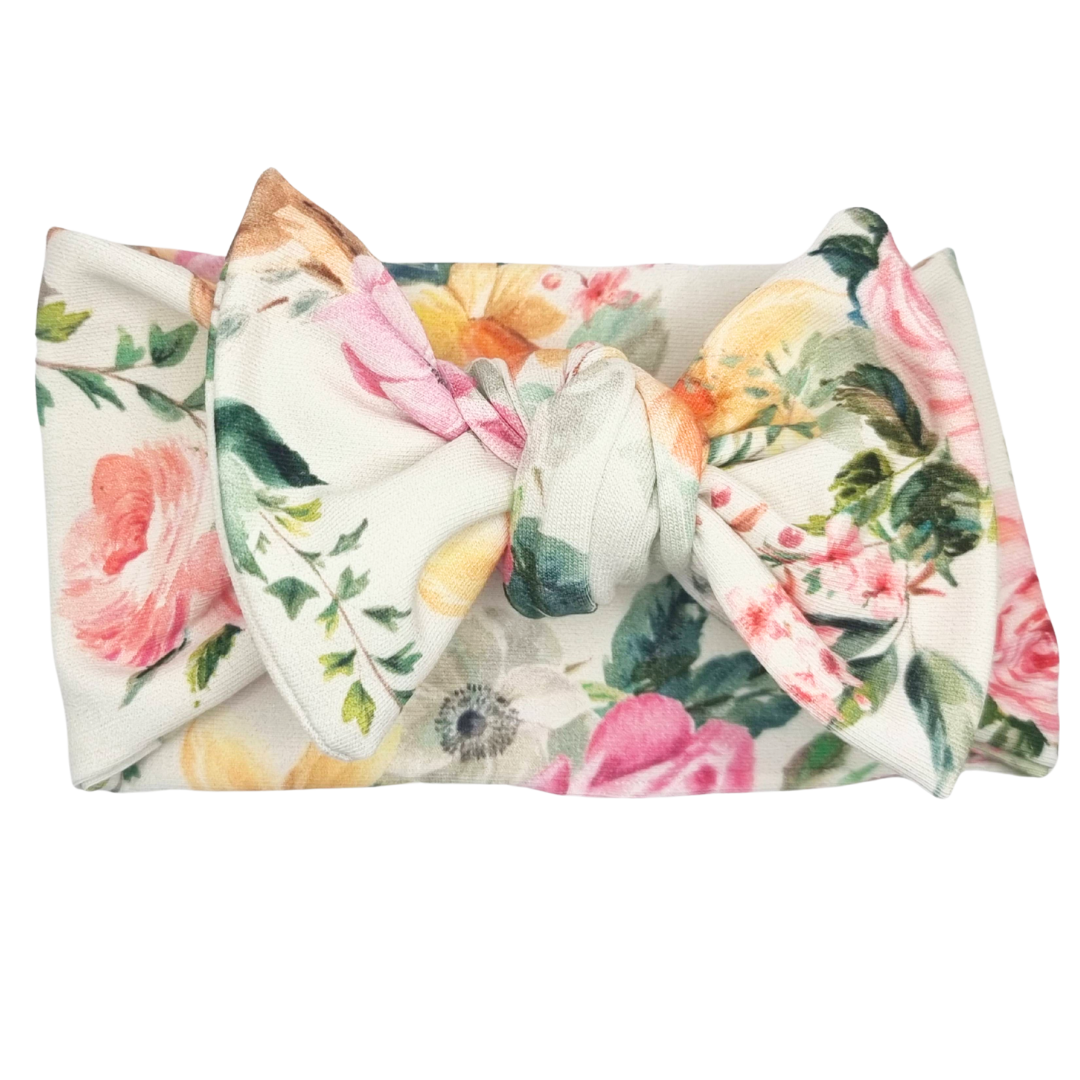Opaska szeroka z kokardą śmietankowa w kolorowe kwiaty
