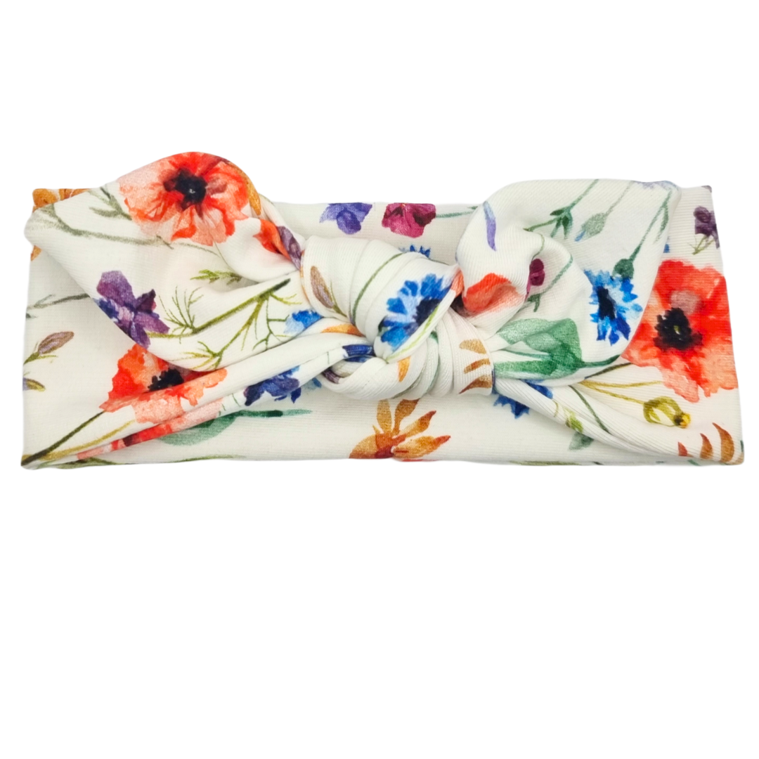 Opaska z kokardą ecru w maki i kwiatuszki