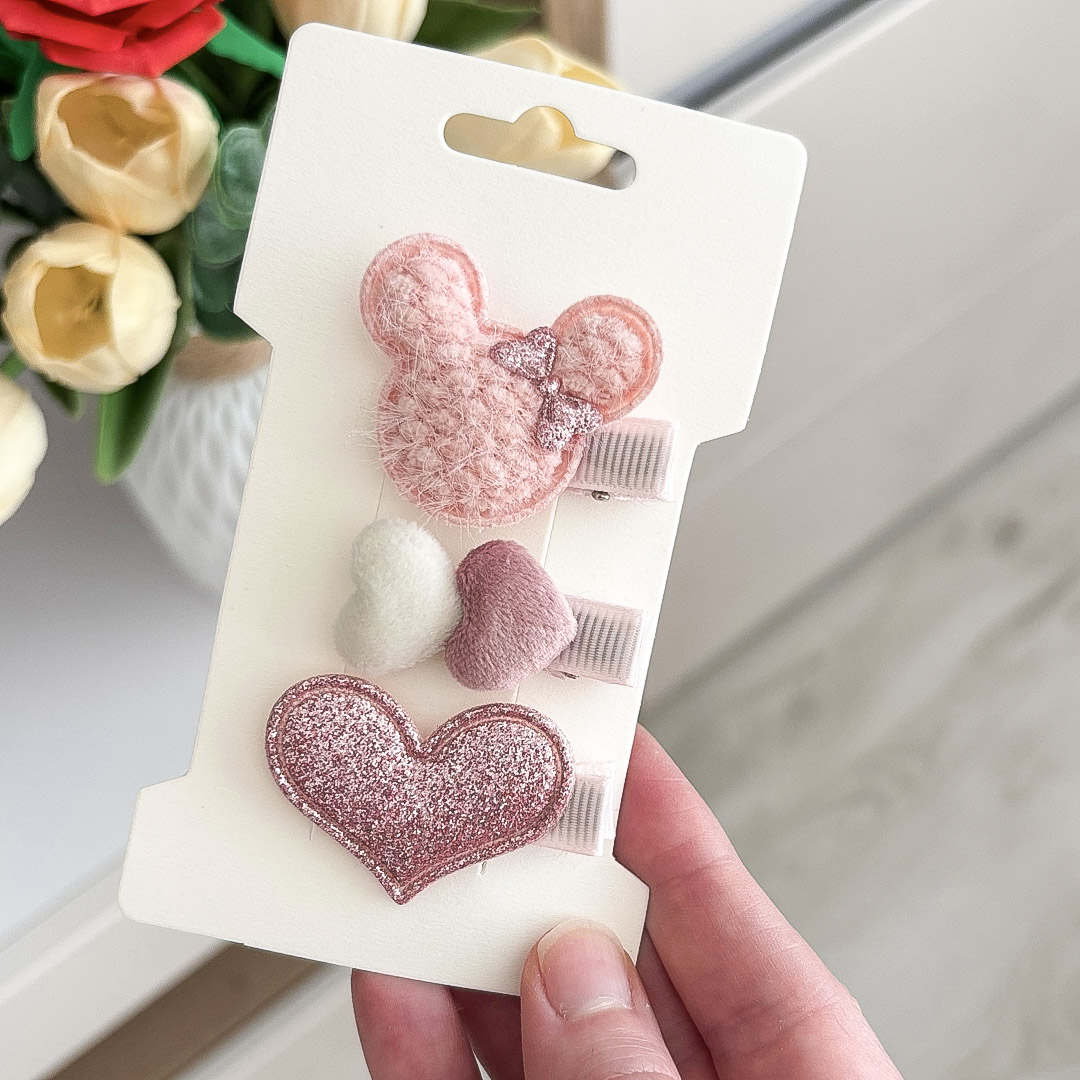 Uroczy zestaw trzech delikatnych spinek idealnych dla niemowląt i małych dziewczynek.  Spinki wykonane są z miękkich, przyjemnych w dotyku materiałów, dzięki czemu są bezpieczne dla wrażliwej skóry dziecka i nie ciągną włosków.